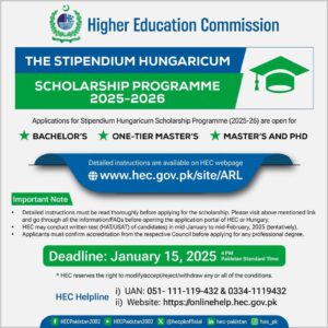 The Hungarian Scholarship Program offers Pakistani students the opportunity to pursue higher studies in Hungary. For details and application submission, visit HEC’s official website.