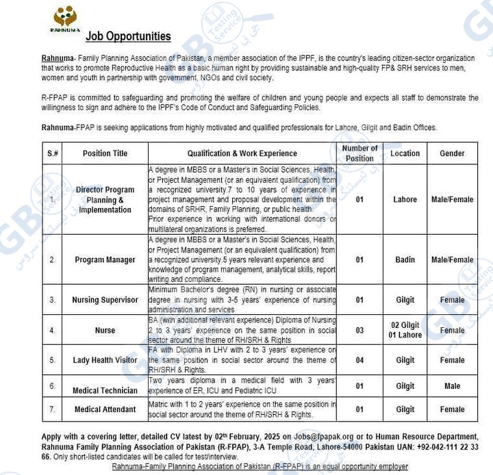 Please submit your application with a covering letter and detailed CV by February 2, 2025, to Jobs@fpapak.org or to the Human Resource Department at Rahnuma Family Planning Association of Pakistan, 3-A Temple Road, Lahore-54000, Pakistan.