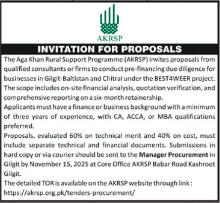 The Aga Khan Rural Support Programme (AKRSP) has announced an exciting opportunity for qualified consultants and firms to submit proposals for conducting pre-financing due diligence for businesses in Gilgit-Baltistan and Chitral under the BEST4WEER Project.