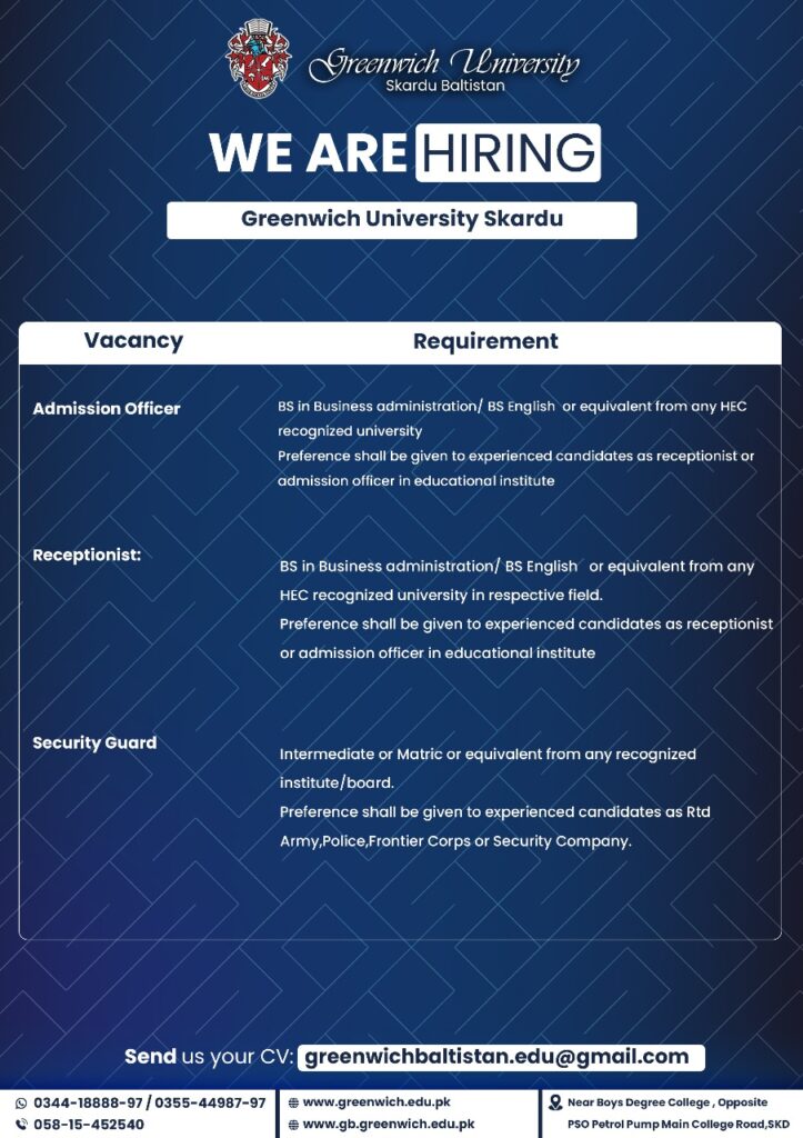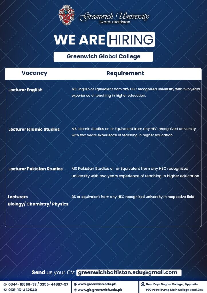Available Positions & Requirements How to ApplyInterested candidates should send their CVs to greenwichbaltistan.edu@gmail.com. Contact Information📞 0344-18888-97 / 0355-44987-97📞 05815-452540🌐 | http://www.gb.greenwich.edu.pk/📍 Near Boys Degree College, Opposite PSO Petrol Pump, Main College Road, Skardu. This is a fantastic opportunity to contribute to higher education in one of the most scenic regions of Pakistan. Apply now