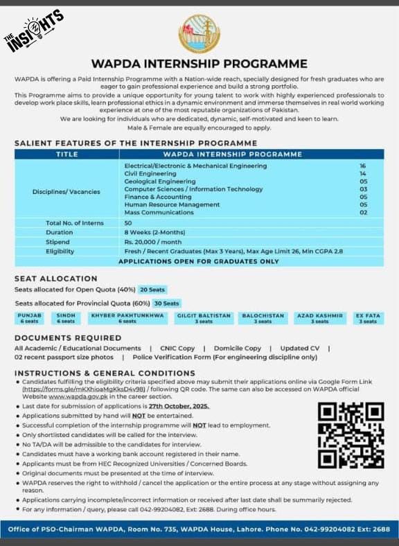 WAPDA Internship Programme 2025 for Fresh GraduatesWAPDA is offering a paid internship programme with a nationwide reach, designed for fresh graduates eager to gain professional experience and build a strong portfolio. This is a unique opportunity to work with highly experienced professionals in one of Pakistan’s most reputable organizations.
