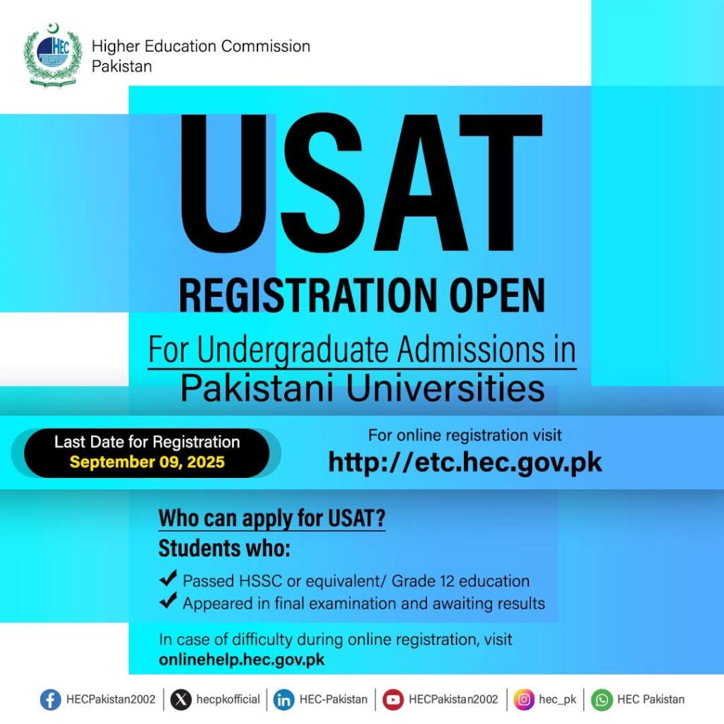 Are you ready to take the first step toward your dream university? The Higher Education Commission (HEC) has opened registration for the Undergraduate Studies Admission Test (USAT) 2025—your gateway to undergraduate admissions in Pakistan! Important Dates to Remember📅 Test Date: September 28, 2025📝 Registration Deadline: September 9, 2025🔗 Apply Now: https://etc.hec.gov.pk/ What is USAT?The USAT,