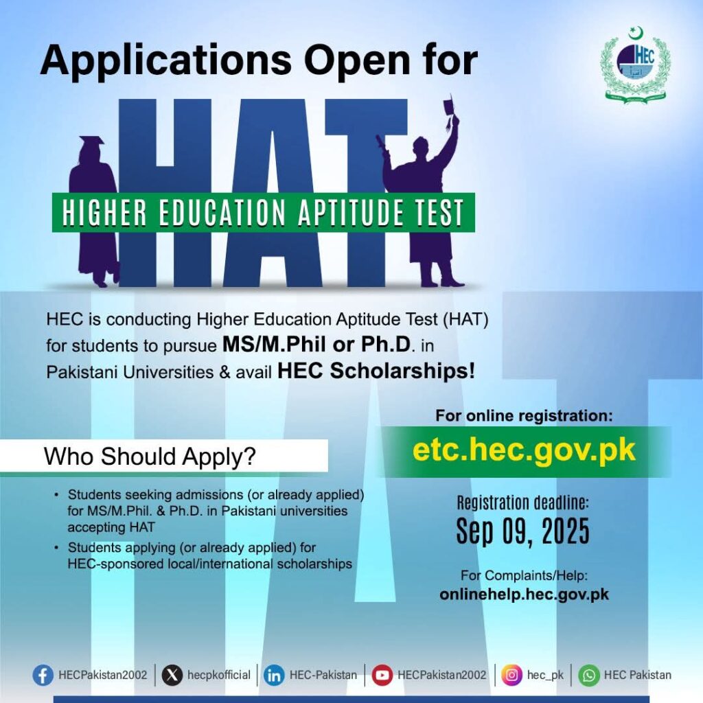 Dreaming of securing admission to MS/M.Phil. or Ph.D. programs or winning prestigious HEC scholarships? The wait is over! The Higher Education Commission (HEC) has officially opened applications for the Higher Education Aptitude Test (HAT) 2025. This is your golden ticket to advancing your academic journey in Pakistan’s top universities! Why Take the HAT?The HAT is