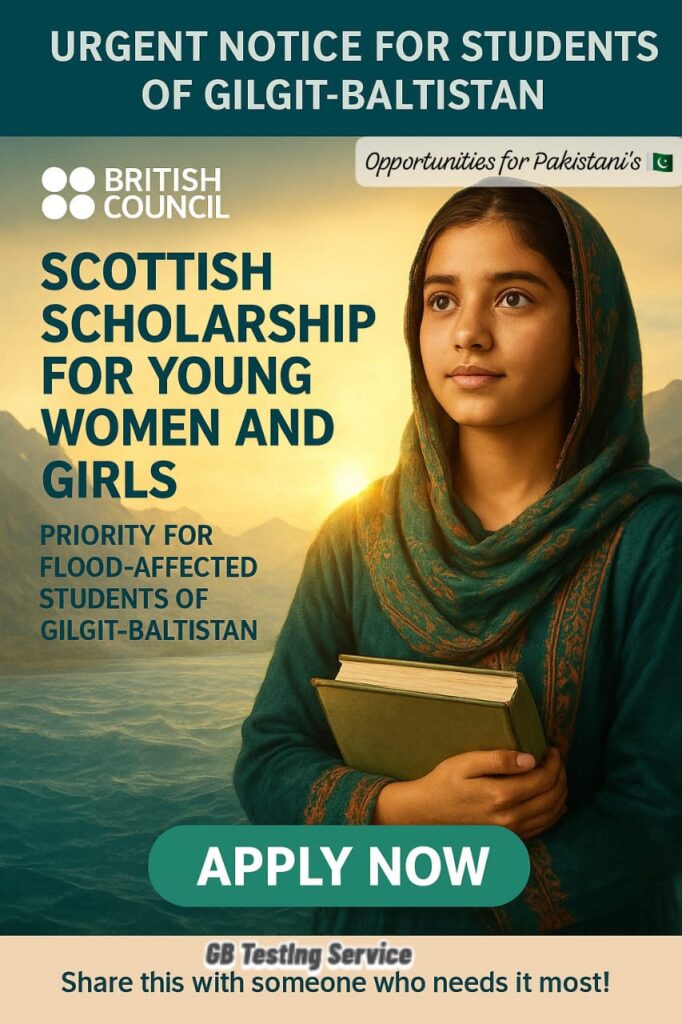 🌟 Attention, students of Gilgit-Baltistan! The Scottish Scholarship for Young Women and Girls is now open, offering a life-changing opportunity to pursue higher education. This initiative prioritizes flood-affected students from the region, aiming to empower young women through education and promote gender equality. Why Apply?This fully funded scholarship, a collaboration between the British Council and