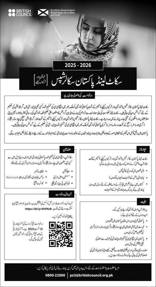 🌟 Calling all ambitious young women in Pakistan! The Scottish Pakistan Scholarships for Young Women and Girls 2025–2026 is now open for applications. This fully funded initiative, sponsored by the Scottish Government and administered by the British Council Pakistan, is designed to support female students in pursuing higher education in HEC-recognized universities across Pakistan. What’s