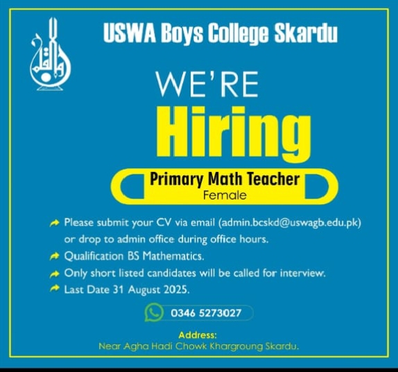 Job Opportunity: Primary Math Teacher at USWA Boys College Skardu