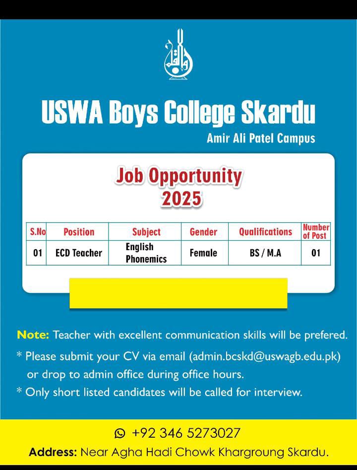 USWA Boys College Skardu is seeking a qualified female teacher for the position of ECD Teacher, specializing in English Phonetics. This is a fantastic opportunity for individuals passionate about education and making a difference in the lives of young students. Job Details: Requirements: How to Apply: If you are interested in this exciting opportunity, please
