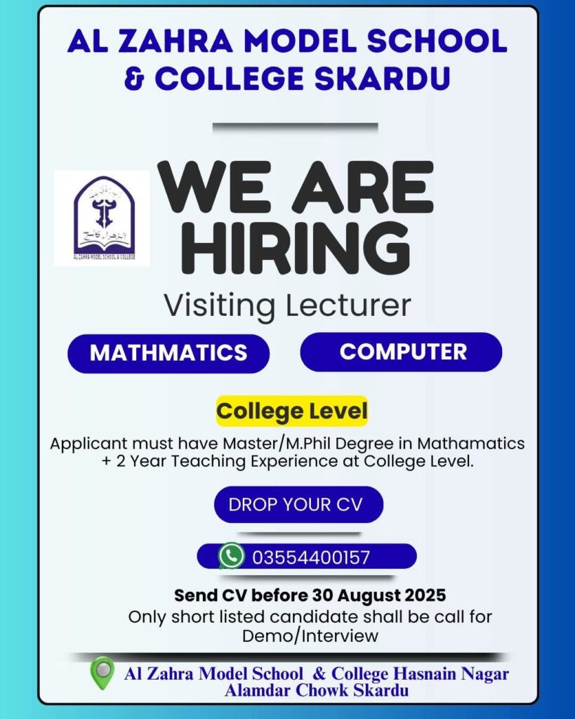 Al Zahra Model School & College Skardu is currently seeking qualified candidates for the position of Visiting Lecturer in Mathematics and Computer Science at the college level. This is an excellent opportunity for individuals with a passion for teaching and a strong academic background. Requirements: How to Apply: If you are a motivated and experienced