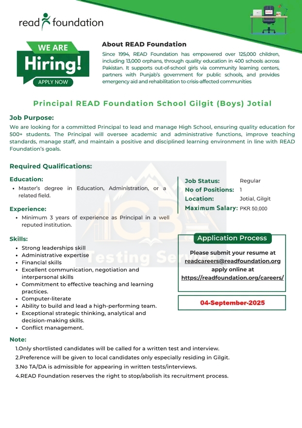 Join READ Foundation as Principal: Empowering Education in Gilgit
