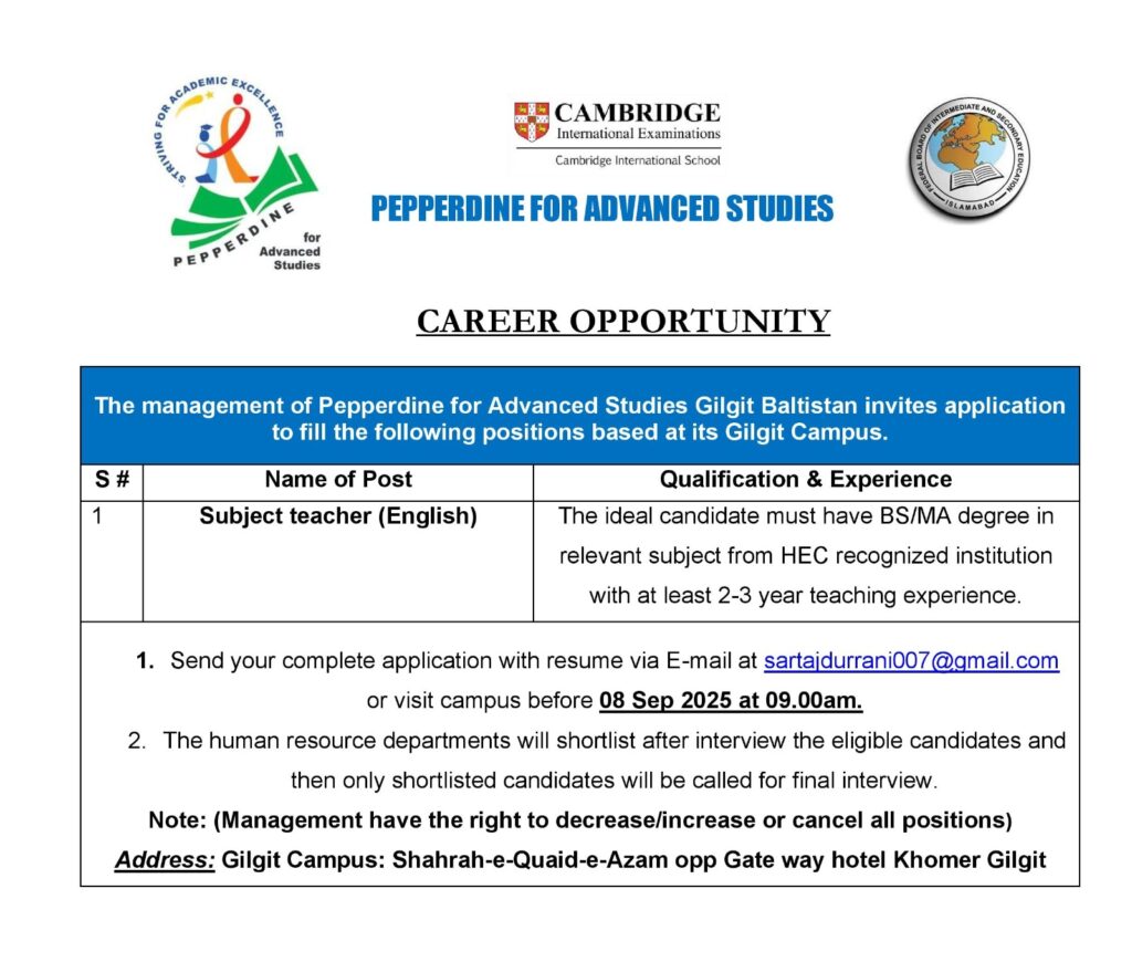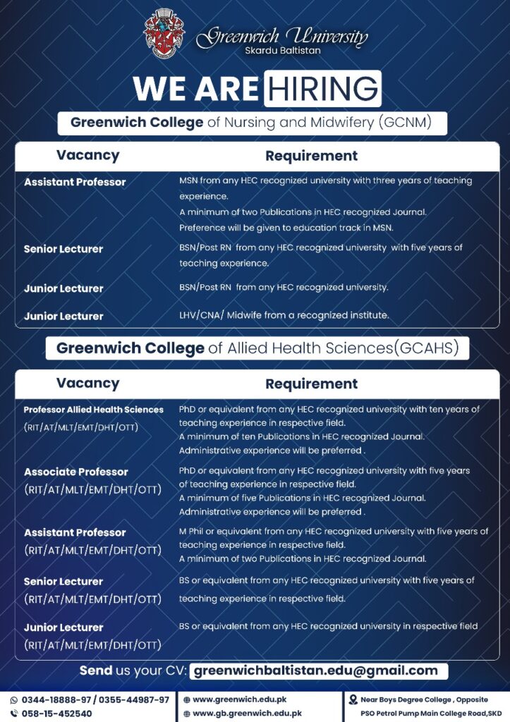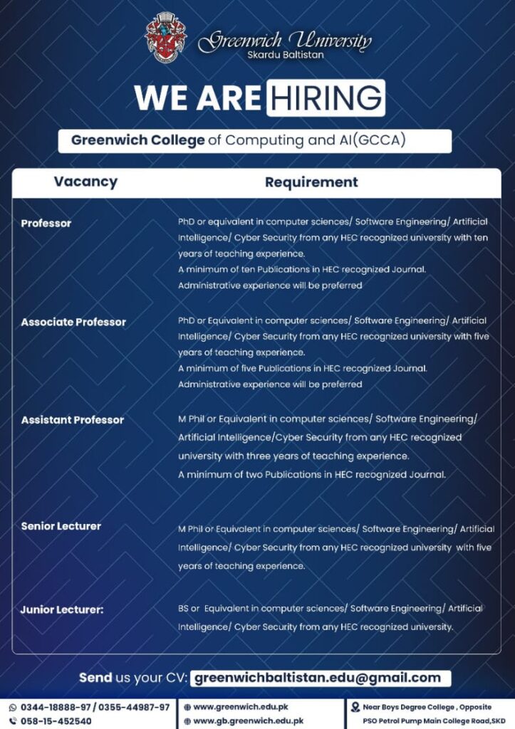 Available Positions & Requirements How to ApplyInterested candidates should send their CVs to greenwichbaltistan.edu@gmail.com. Contact Information📞 0344-18888-97 / 0355-44987-97📞 05815-452540🌐 | http://www.gb.greenwich.edu.pk/📍 Near Boys Degree College, Opposite PSO Petrol Pump, Main College Road, Skardu. This is a fantastic opportunity to contribute to higher education in one of the most scenic regions of Pakistan. Apply now […]
